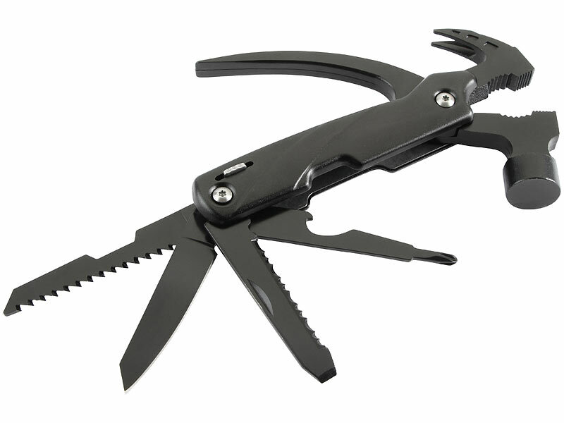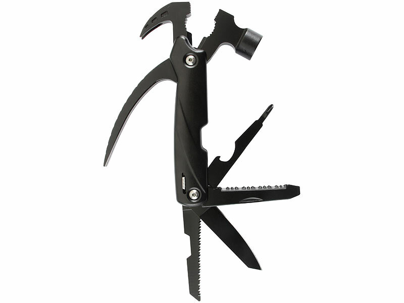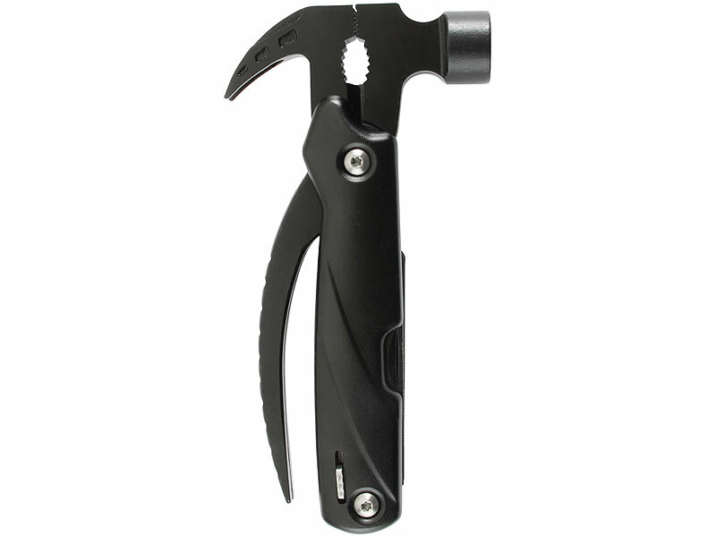 Kompakter Alleskönner: mit Messer, Klauenhammer, Flachzange, Flaschenöffner, Rohrzange, Draht-/Kabelschneider, Hammerkopf, Sägeklinge, Nagelfeile, Schlitzschraubendreher, Kreuzschlitzschraubendreher und Fischentschupper